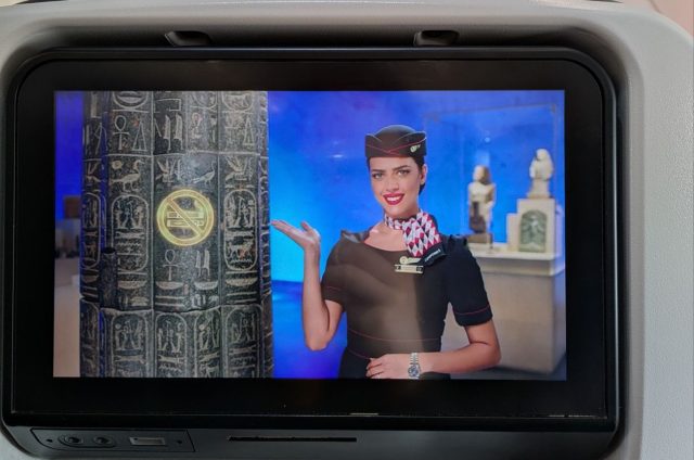 そして搭乗、久しぶりのモニター画面と緊急時のインストラクションです。エジプト航空だったのでヒエログリフを用いたエジプトらしい説明がなんだか素敵でした。お菓子とお水が配られます。一時間半と短時間フライトだったのであっという間にカイロに到着です。