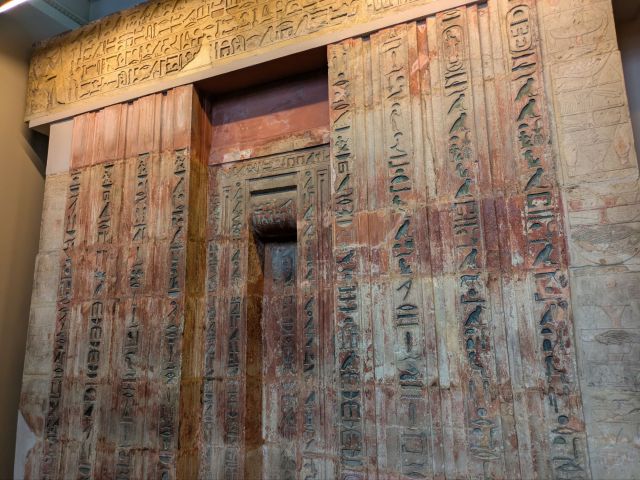 こちらは古代エジプト第5王朝のプタハシェプセスの墓の偽扉です。プタハシェプセスは、古代エジプト第4王朝末期から第5王朝初期にかけて活躍した高官で、非常に地位の高い人物でした。彼の墓はカイロのサッカラにあるそうです。
