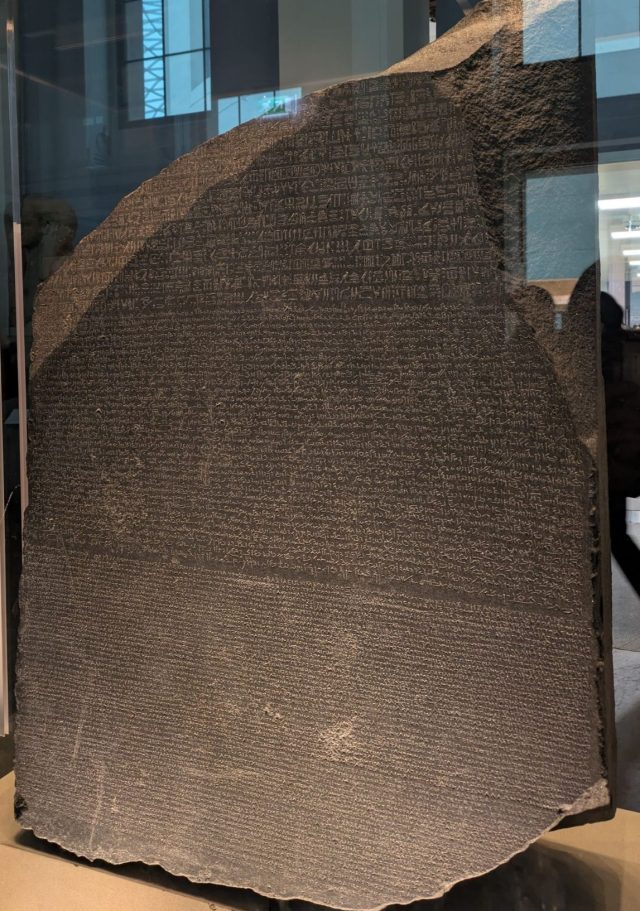 ロゼッタストーンは古代エジプト文字解読の決定的な手掛かりとなった石碑です。