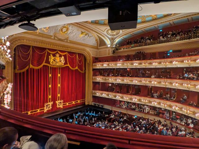座席にたどり着きました。とにかく美しいロイヤル溢れる劇場で、装飾から色から本当に素敵な空間に圧倒されました。座席は備え付けではなく後付けされたもので、ステージは見切れないけれど訳アリ席のような感じだったので£134でした。上からの席だったので劇場全体が見渡せ、ステージ下のオーケストラもばっちり見えました。