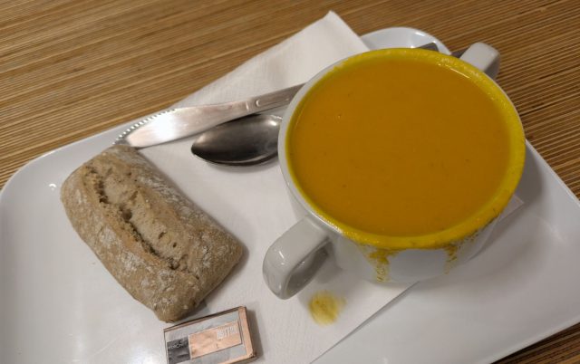 本日のスープのキャロットスープと硬めのパン(£6)をオーダーしました。スープは素材の味が生かされた優しめの味で、何杯でも飲めそうなくらい美味しかったです。スープを飲みながら今回見に行くバレエの演目「Giselle(ジゼル)」についてのあらすじをおさらいをしていました。