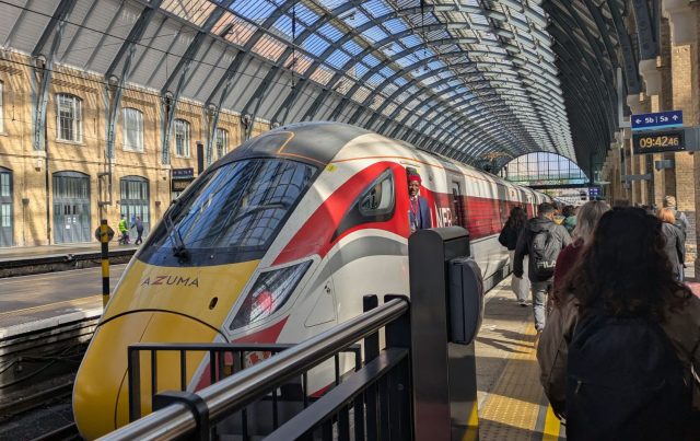 下の方に書いてあるLNER Azumaというのは運行会社と車両の種類です。JR東・西日本のこだま、ひかりみたいな感じです。Azumaというのはなんと日本の日立製の東(あずま)だそうです。結構出発のギリギリにプラットフォームが決まるので表示されてから足早に向かいます。