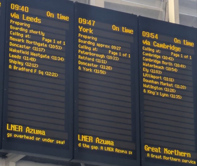 ハリーポッターでお決まりのキングスクロス、電車のチケットは事前にオンラインで購入です。往復で約£60程でした。電光掲示板にプラットフォームが表示されるのを待ちます。