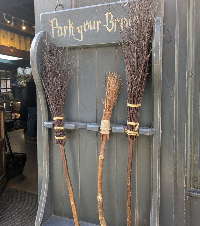 ダイアゴン横丁っぽいということでお店もハリーポッターグッズが多めでした。こちらは「Park your broom」と書かれた箒置き場です(笑) 魔法使いたちが来ている様な雰囲気にさせてくれます。