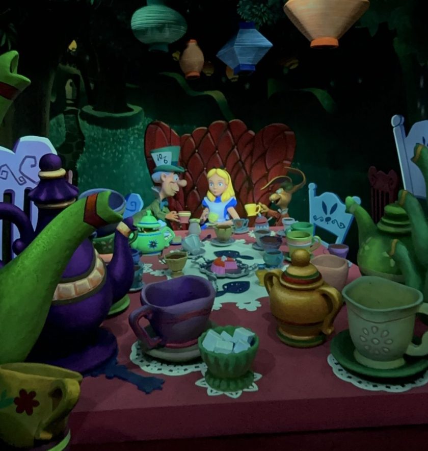マッドハッターと三月ウサギとのティーパーティーです。テーブルにごちゃごちゃ並んだカップやデザートたち、ちょっと暗いのですがカラフルでかわいかったです。ちなみにこのライドは屋内だけではなく屋外にも出るのでなんだか新鮮。屋外部分の高架走行がユニークなため、カリフォルニアにしか作れなかったんだとか。